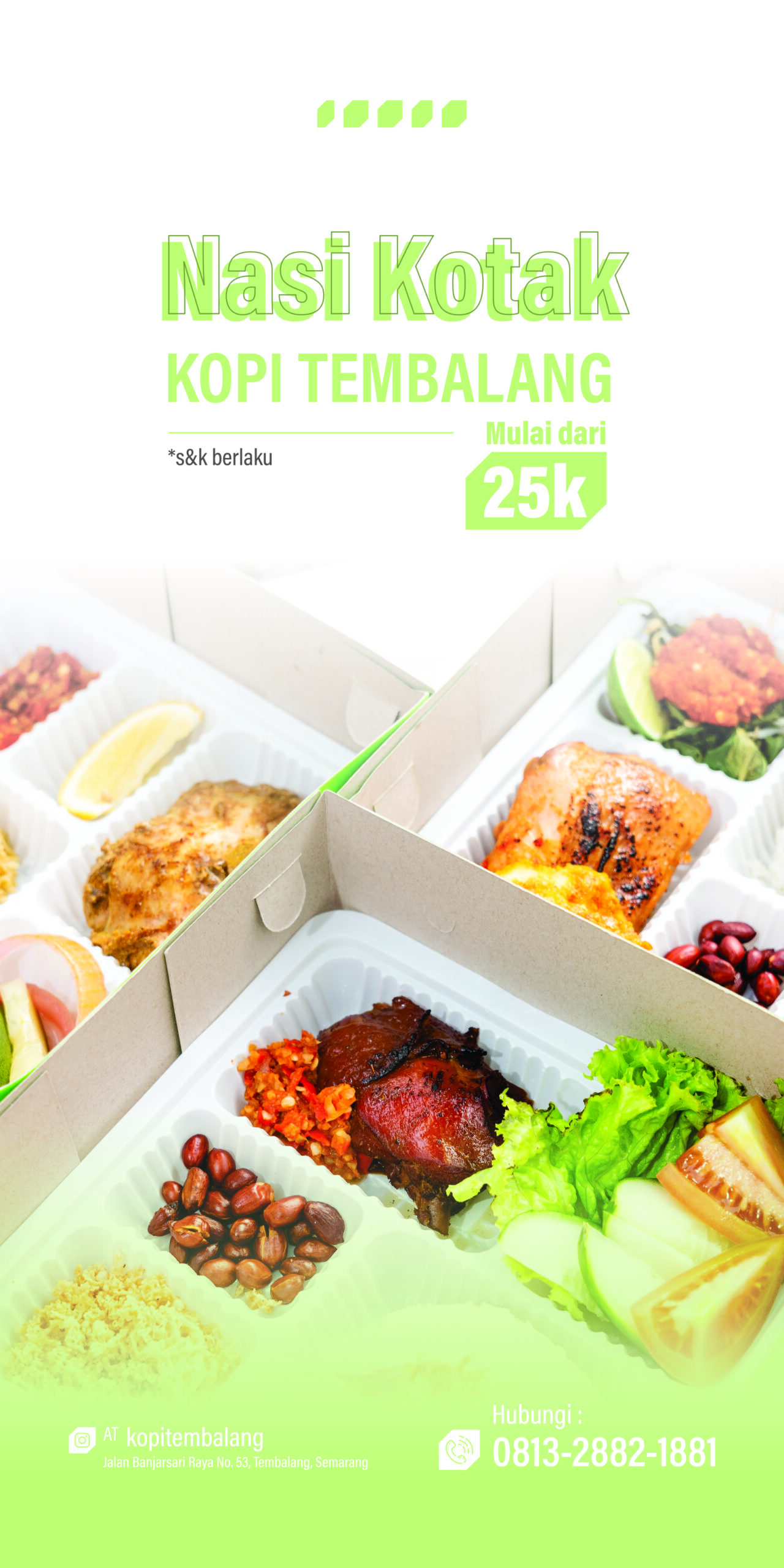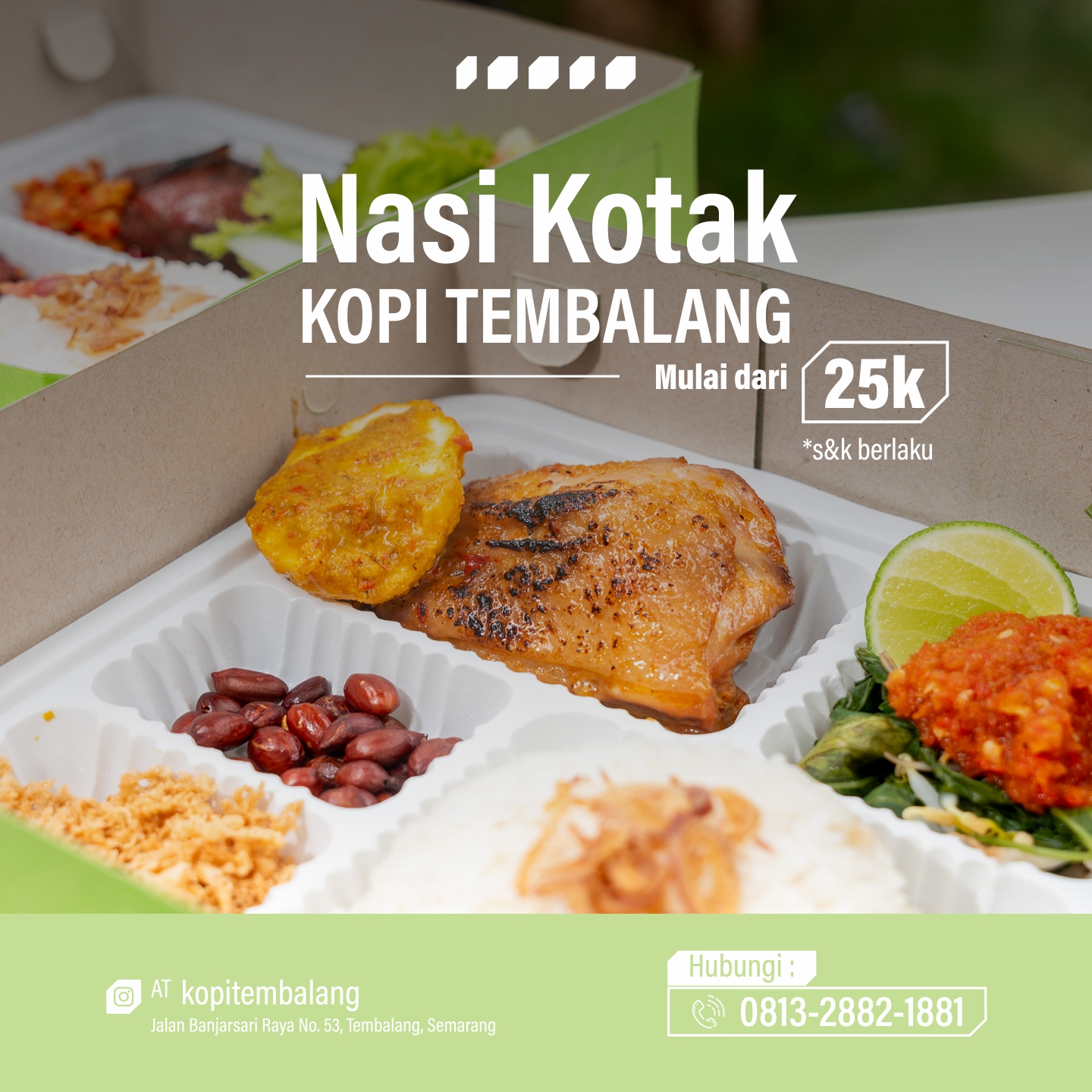 Sedang mencari nasi kotak yang lezat dan terjangkau di Tembalang? Tidak perlu mencari lagi! Di Nasi Kotak Kopi Tembalang, kami menawarkan pemesanan "Nasi Kotak" mulai dari hanya 25k. Cocok untuk berbagai acara—baik itu rapat, kumpul keluarga, atau acara spesial lainnya.